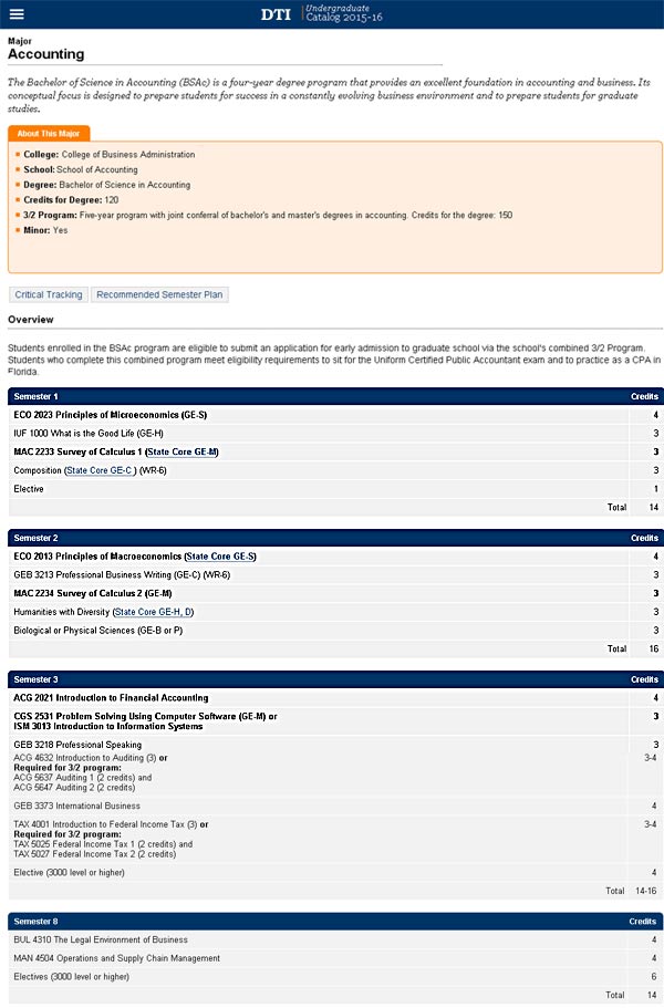 Accounting Course The Master of Accountancy (MAcc) program prepares graduates to succeed as accountants and advisors to organizations in today’s dynamic, global business environment. Students will develop technical, interpersonal, critical-thinking, and communication skills to enable them to derive and interpret information used by investors, managers, and governments. Dolphin Technical Institute(Beaumont) MAcc graduates possess strong technical skills in the functional areas of accounting (financial, tax, managerial, governmental/NFP) that lay the foundation for success in today's business world. Whether working for one's own firm, a corporate accounting department, a public accounting firm, or a nonprofit or government agency, success in the accounting profession typically includes successfully passing the Certified Public Accountant (CPA) Exam. Accounting programs at the School of Business prepare students for a career in this dynamic profession and for successful completion of the CPA exam. In nearly all states, the CPA exam can only be taken after completing a 150-hour program of study. A combination of the B.S.B.A. accounting major and the MAcc degree fulfills this requirement. Taking the MAcc courses upon completion of the undergraduate degree places students in the workforce only one year after completing an undergraduate degree program and the MAcc program. Continuation of Financial Accounting. It provides an in-depth coverage of the accounting system and basic financial statements learned in the first financial accounting course. Selected accounting items are covered with an emphasis on the topics of interest to financial managers including revenue recognition, statement of cash flows, working capital, cash and receivables, and long-term liabilities. Formerly MGT. 5369 or MGT 7368 ACCT 5326: Intermediate Financial Accounting II Continuation of Intermediate Financial Accounting I. Selected accounting items are covered with an emphasis on the topics of interest in corporate financial reporting including investments, leases, pensions, deferred taxes, stockholders equity and earnings per share. Formerly MGT 5370. ACCT 5330: Introduction to Taxation Course concentrates on the basic theories and practices of taxation, including income, consumption and property tax. The main focus is on the U.S. individual tax. The course will involve hands-on experience in preparing both individual and business tax returns. Formerly MGT 5377 Students who took FINA 6365 prior to Summer 2007 may not take this course. ACCT 5350: Accounting Information Systems Study of the manual and automated records, documents, procedures and controls used in accounting systems. Course content emphasis is placed on information technology and the use of technology in financial accounting, decision-making, and auditing. Formerly MGT 6344. ACCT 5360: Auditing A study of the topic of auditing focusing on the audit of financial statements used for external reporting. Topics also covered include professional ethics, internal and operational auditing, forensic accounting, and assurance services. Formerly MGT 6357. ACCT 6300: Accounting for Managers This course focuses on the acquisition, analysis, reporting and use of both external and internal financial information about business events important to managers and the organization. The course emphasizes the transformation of information into basic financial statements; an introduction to knowledge and skills relevant to the internal use of accounting information and techniques in support of planning and control management decisions and budgeting for business operations; management accounting methods, terms and practices; and an introduction to financial management and the time value of money. ACCT 6330: Financial Statement Analysis Advanced financial accounting course focusing on the analysis of statements including shareholder's equity, income, balance sheet, and cash flow. Topics include the analysis of financing and investing activities, profitability, growth, economic value, and valuation of operations and debt. ACCT 6340: Corporate Tax The study of federal income tax regulations and accounting for corporations and shareholders. Topics include a detailed examination of corporate formation, capital structure, income taxation, and income distribution. Formerly MGT 6327. ACCT 7340: Advanced Accounting Provides in-depth coverage of financial reporting topics including: business combinations, partnerships, segment and interim reporting, foreign currency transactions, and governmental and not-for-profit accounting. Formerly MGT 7369. ACCT 8380: Accounting Research Methods Research methods for solving complex accounting and reporting issues including both financial accounting and tax accounting cases. Prerequisite: 3 credit hours of tax; 3 credit hours of intermediate accounting. ACCT 8395: Accounting Theory Course serves as the practicum to and fulfills the research requirement for the M.S. in Accounting. Course concentrates on advance topics of U.S. Generally Accepted Accounting Principles. This course focuses on the practice of accounting and the application of GAAP and is the last course taken in the MS program. Formerly MGT 8385. BUAD 6330: Business Communication Course focuses on developing skills relevant to effective written and oral communication in applied business contexts. Students will practice skills in technical and commercial writing, electronic communications, visual/graphic presentation, interviewing and information gathering, and expository, persuasive, and extemporaneous speaking. Applications will be drawn from corporate summaries and reports, accounting statements and opinions, and managerial, employment, public relations and marketing communications. BUAD 6390: Business Ethics Develops a coherent framework, focused on the concept of virtue, for resolving ethically challenging situations in management and integrating the manager's personal life and values 
